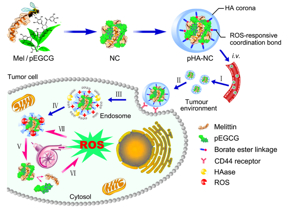 动物毒肽是很多中药动物药的主要功效物质,具有药效活性强、作用机制明确等优势,但存在体内分布广、易代谢、毒副作用大的弊端,制约临床转化应用。众所周知,中药煎煮过程中,鞣质与蛋白成分会发生自沉淀现象。受此启发,课题组借鉴葡萄酒酿造工艺,仿生制备了聚多酚功能载体,并用于动物蛋白、毒肽类成分的纳米化和靶向递送。研究选取蜂毒肽(Mel)作为模型药物,与聚多酚(pEGCG)构建纳米复合物(NC),并将硼酸衍生化透明质酸(pHA)锚定在NC表面用于肿瘤主动识别。制备的pHA-NC可靶向至肿瘤,并被肿瘤高表达的透明质酸酶(HAase)降解暴露出内核,在Mel作用下逃逸出溶酶体进入细胞质。胞质内高活性氧(ROS)环境可触发硼酸酯键断裂和药物释放。作为天然助氧剂的Mel和pEGCG可进一步诱导ROS产生,使胞内ROS持续升高至耐受阈以上而致细胞死亡。该体系借鉴了中药制剂“药辅合一”的制药理念,pEGCG既可作为功能载体,又兼具药性,减少了辅料的使用。构建的ROS正反馈回路宛如一个智能动力泵,持续、可控地放大肿瘤细胞内的ROS信号,打破了肿瘤的内稳态,产生显著的肿瘤抑制效果。