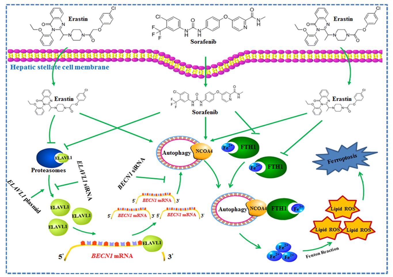 肝纤维化(Liver fibrosis)是各种慢性肝病的共同病理过程,目前临床尚无有效的抗肝纤维化治疗药物。肝星状细胞(hepatic stellate cells, HSCs)活化是肝纤维化发生发展的核心环节,靶向诱导HSC死亡是防治肝纤维化的有效措施。铁死亡(Ferroptosis)是近年来发现的一种全新的细胞死亡方式,靶向诱导HSC铁死亡有望成为肝纤维化治疗的新策略。课题组研究发现临床药物sorafenib以及临床前药物erastin能够靶向诱导HSC铁死亡的发生,且这一过程与RNA结合蛋白ELAVL1/HuR水平升高有关。进一步的机制研究发现,RNA结合蛋白ELAVL1/HuR能够与自噬关键基因BECN1 mRNA 3’UTR中的AUUUA碱基序列特异性结合,进而稳定BECN1的表达,促进整体自噬水平,诱导NCOA4与FTH1结合,靶向降解储铁蛋白,过度释放铁离子,最终导致铁死亡的发生。