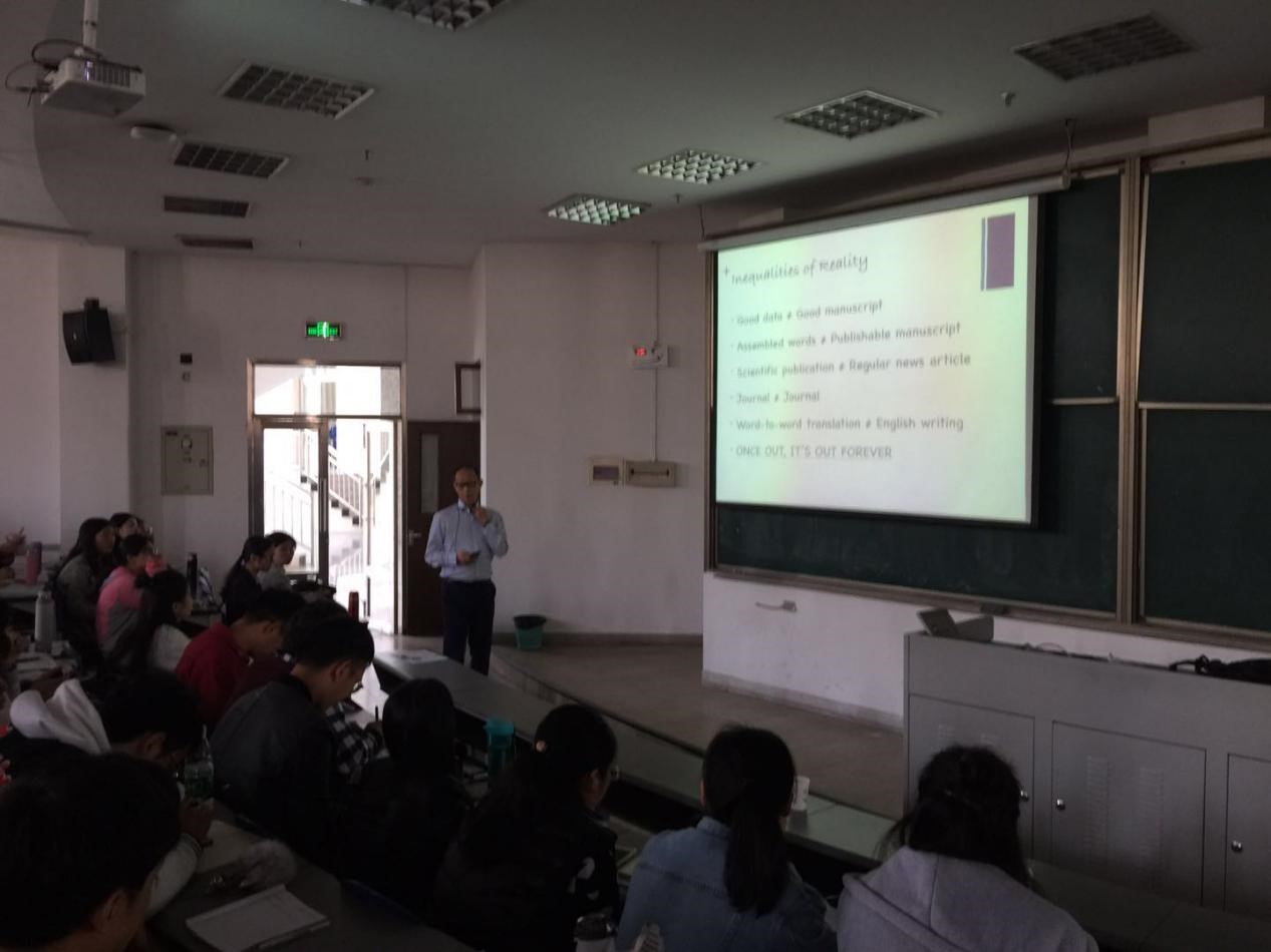 报告结束后,顾教授又给全体研究生讲授了“课题选择及科研论文写作与发表”的公开课。他结合自己的研究实际,深入浅出地讲述了自己如何从日常生活中发现课题的过程。顾教授从夏季人们经常使用的防晒霜和驱蚊剂中,萌发出评价二者联用的安全性问题,并对二者的使用顺序、使用比例、使用时间等因素进行了深入探究,相关结果被知名媒体《时代周刊》报道,产生了广泛的社会影响。随后就论文发表的相关事项,如期刊选择、撰写准备、文章框架、书写规范和投稿说明等作了全面的分析和讲解,对研究生写作中经常出现的问题作了精辟的分析和指导。