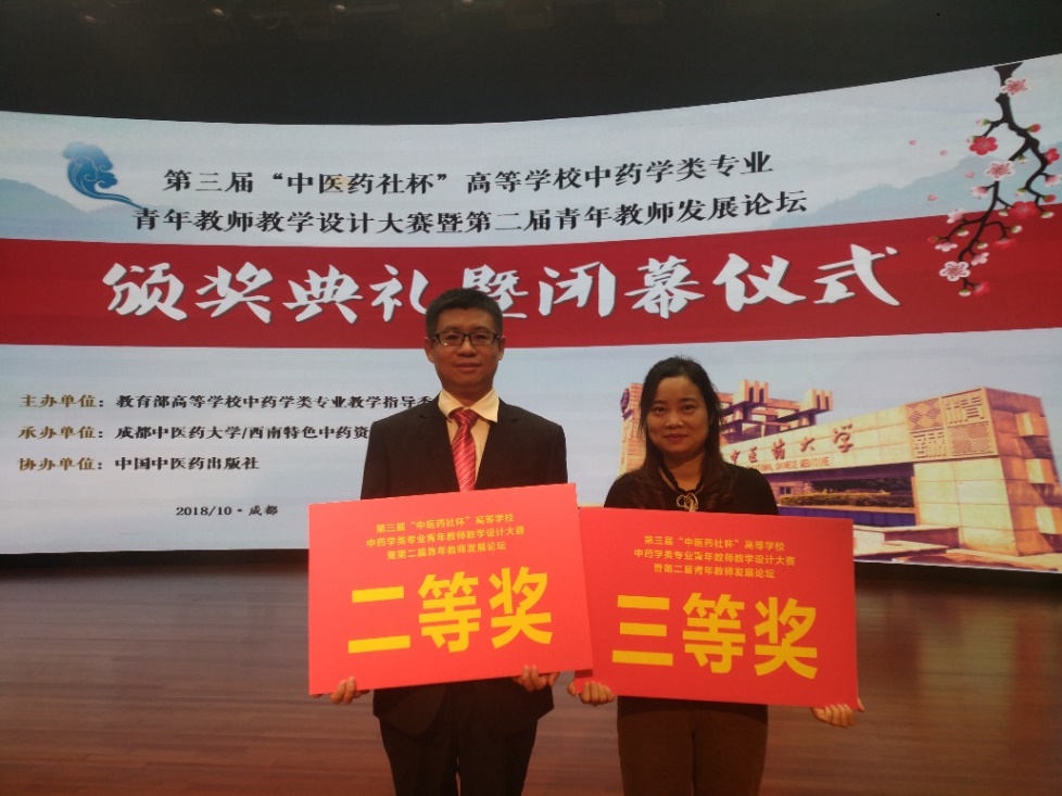 本次大赛,共有42所高校提交156件教学设计和教学论文,98位老师获得参加现场教学资格。现场教学要求在规定时间抽签,提交教学设计,PPT,进行20分钟现场教学及回答专家提问。最终综合各项成绩排名,评出一等奖6名,二等奖18名,三等奖24名。公司中药药理学教研室喻斌老师、蒋宝平老师在中药药理学教研室课程团队及公司各位专业老师指导、帮助下,认真准备,勇于接受挑战,经过一系列激烈角逐,最终分别获得第三届“中医药社杯”高等公司中药学类专业青年教师教学设计大赛高级组二等奖,中级组三等奖,创下公司参加该项赛事以来的最佳成绩。