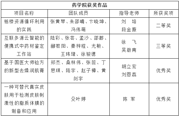 在本次决赛中公司研究生张黄琴、陆彩、殳叶婷、郑杰等沉着应对,凭借极高的专业素养,灵活的应变能力,在比赛中表现良好。最终,4项作品分获二等奖1项、三等奖1项、优秀奖2项。段金廒老师,刘培老师获优秀指导教师奖。