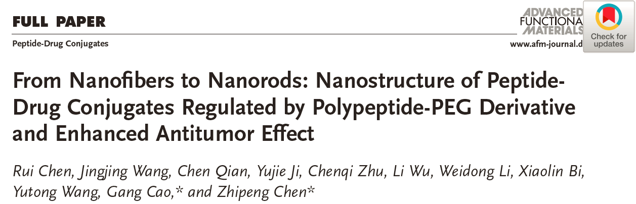 近日,材料学领域权威期刊Advanced Functional MaterialsIF 13.3)在线发表了PlayAce游戏平台陈志鹏团队的最新研究成果“From Nanofibers to Nanorods: Nanostructure of Peptide-Drug Conjugates Regulated by Polypeptide-PEG Derivative and Enhanced Antitumor Effect”。PlayAce游戏平台陈瑞老师为第一作者,陈志鹏教授为通讯作者。