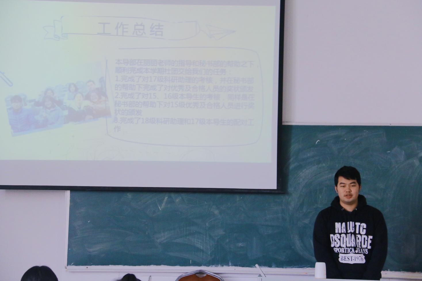 接着,各部门部长以此上台对本学期的工作进行总结。秘书部部长程荣勇于解剖自己,对秘书部申请场地具体内容了解不足、证书的制作上耗时较久等问题进行了自我批评,并为这些问题的改正提供了方法,同时她也觉得,同学们之间需要交流,也需要传承和包容。宣传部副部长陈媛向大家展示了各个活动海报以及推送,还分享了制作海报的心得;新闻部部长李思勉给大家展示了新闻部成员的照片和写稿的记录,对同学们的认真负责点赞;外联部部长曾佳雯幽默地表达了这半年来部门拉赞助的不足,提出希望明年能有机会办好羽毛球大赛;论文部部长赵铭展示了部员照片,并提出了下学期的工作规划;科发部部长曹祥向大家展示了最近成功举办的中药传统技能大赛,并提出了下学期的规划,即举办精密仪器培训班和联谊活动;本导部部长陈家乐感谢了张丽丽老师的大力支持、秘书部的帮助,也感谢全体社员的一路风雨同行。