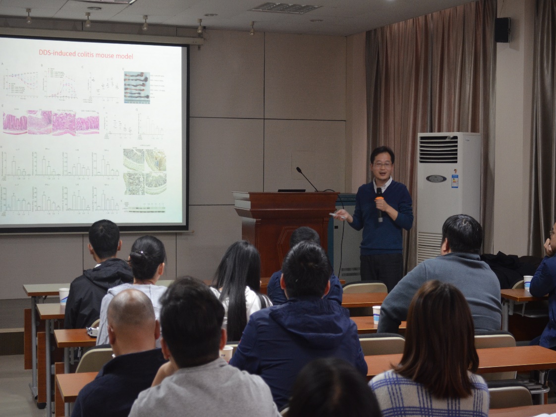 孙洋教授现为国家优青基金获得者,南京老员工命科学公司生物技术与药学系主任,医药生物技术国家重点实验室PI,长期从事炎症相关疾病及调控药物的基础与应用的研究。汇报中他以诙谐风趣的语言,从发现小分子化合物的独特药理活性、揭示特征性药理活性所蕴含的新生物学事件和分子机制为切入,讲解了抗类风关药艾得辛和喜炎平注射液的临床转化医学研究。相关结果对于中药大品种的科学合理用药,具有重要意义。孙教授提出的基于临床治疗特色和活性成分结合靶点的差异性生物效应研究策略,引起了广大师生的兴趣,并进行了热烈讨论。
