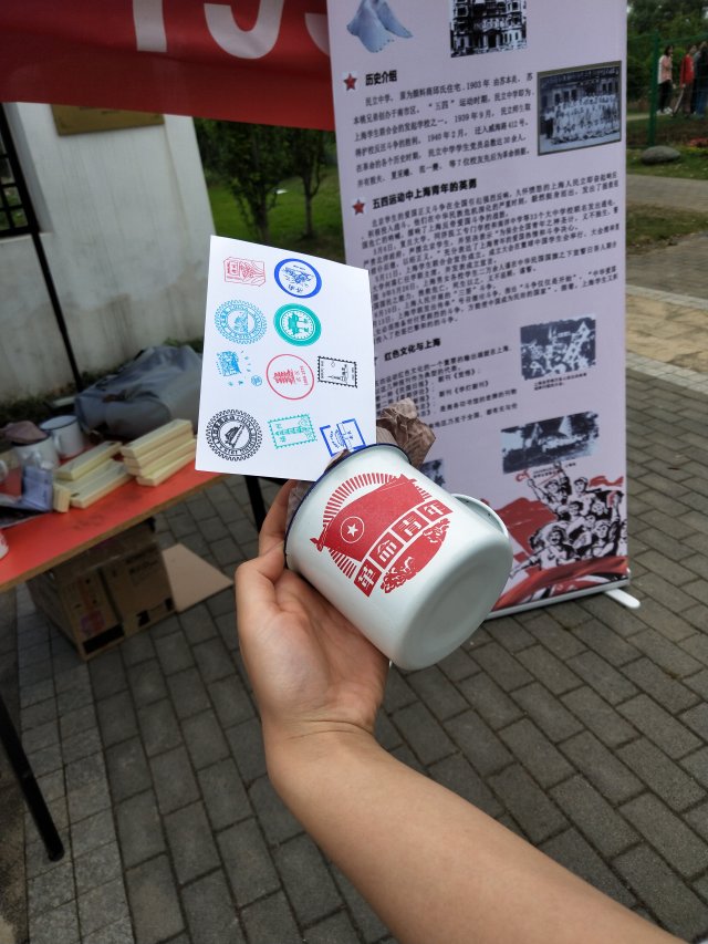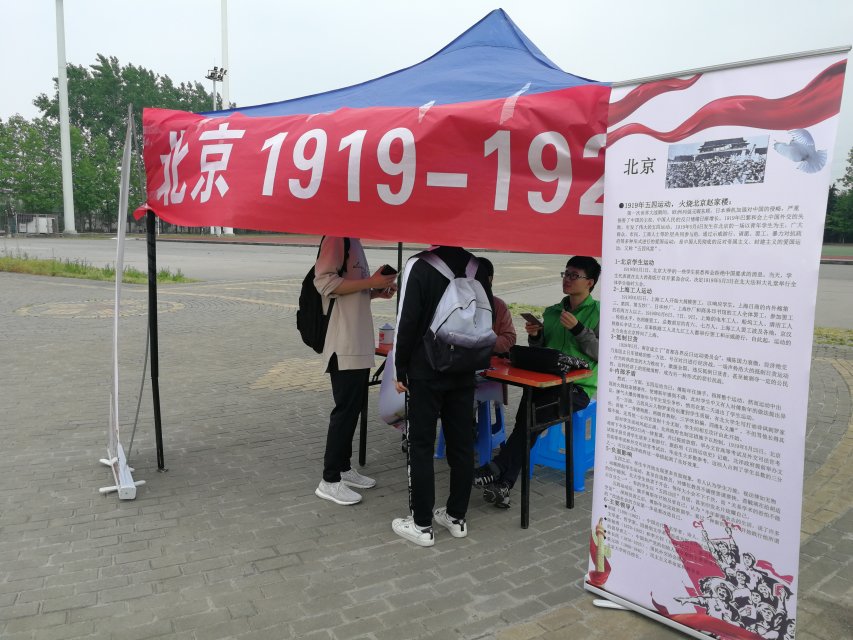 场地及工作人员安排到位后,便是和参与者们的互动时间了。活动伊始,我们的第一个邮戳点就聚满了慕名而来的参与者。志愿者们首先热情地为大家讲解了五四运动爆发城市北京的特色、历史人物、历史事件等,大家都听得津津有味。通过阅读展板,大家更加深了对五四精神的领悟。接着志愿者拿出有关五四运动的题目让参与者回答。大家都积极认真的思考,“我知道!”题目刚落便有同学说出答案,同时也获得了北京的邮戳!拿到邮戳的参与者们接着开始了下面几个地点的集邮戳之旅,分别是济南、南京、上海等地。而参与者最终也将通过集满十个城市的邮戳来打卡签退。