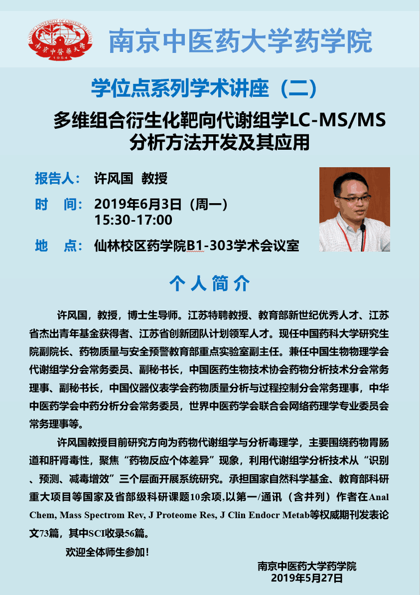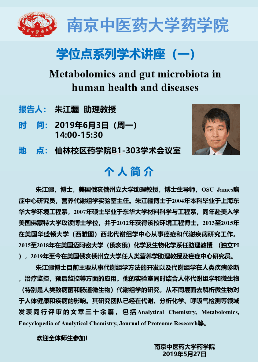 学术讲座--1. Metabolomics and gut microbiota in human health and diseases 2. 多维组合衍生化靶向代谢组学LC-MS/MS分析方法开发及其应用