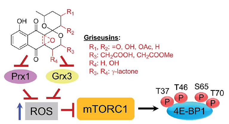 针对这类天然产物的全合成构建及其抗肿瘤作用机制,张毅楠教授和美国合作导师Jon S. Thorson教授从2013年始进行持续深入研究。在前期C-H活化构建griseusin螺氧环的基础上1,系统性地发展了一条具备制备多样性衍生物的全合成路线,并将此路线用于12个griseusin天然结构和8个结构类似物的全合成构建。通过此项全合成研究,张毅楠等还对之前报道的griseusin D和2a,8a-epoxy-epi-4’-deacetyl griseusin B的结构缺陷进行了修正。随后,他们通过以上化合物抑制肿瘤细胞的构效关系总结,明确了本类化合物与之前发现的frenolicin亚类吡喃并萘醌天然产物具有相似的抑制肿瘤细胞增殖的作用机制2——既通过抑制氧化还原酶Prx1和Grx3,提高细胞内活性氧(ROS)水平,造成mTOR对4EBP1磷酸化的抑制产生作用。
