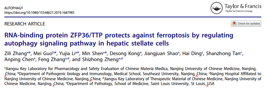 2019年11月,郑仕中教授科研团队继去年在国际著名期刊Autophagy(影响因子11.059)发表了文章“Activation of ferritinophagy is required for the RNA-binding protein ELAVL1/HuR to regulate ferroptosis in hepatic stellate cells”,首次证实靶向诱导活化型HSC铁死亡有望成为肝纤维化治疗的新策略。在此基础之上,目前再一次在线发表最新研究成果“RNA-binding protein ZFP36/TTP protects against ferroptosis by regulating autophagy signaling pathway in hepatic stellate cells”。青年教师张自力为第一作者,郑仕中教授为文章通讯作者。