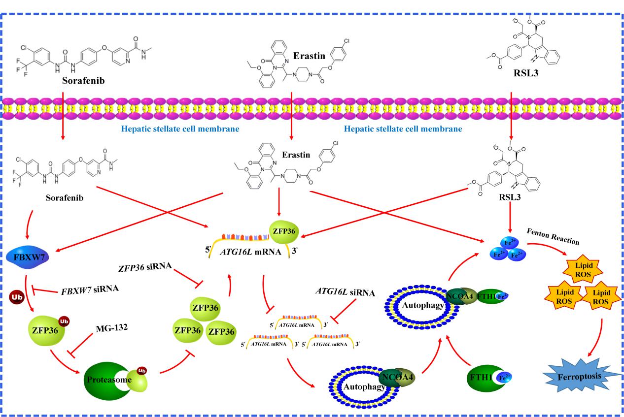 科研团队发现临床药物sorafenib以及临床前药物erastin能够靶向诱导活化型HSC发生铁死亡,且这一过程依赖于RNA结合蛋白ZFP36/TTP表达水平的下调。进一步的机制研究发现,sorafenib与erastin能够促进泛素化连接酶FBXW7靶向识别ZFP36蛋白氨基酸序列 “SFSGLPS”,诱导ZFP36发生泛素化降解,导致ZFP36蛋白表达水平降低。表达水平降低的ZFP36蛋白与自噬关键基因ATG16L1 mRNA 3’UTR中的“UUAUUUAUU”碱基序列特异性结合减少,使ATG16L1 mRNA更加稳定,促进ATG16L1蛋白表达,促进整体自噬水平,诱导NCOA4与FTH1结合,靶向降解储铁蛋白,过度释放铁离子,最终导致HSC铁死亡的发生。