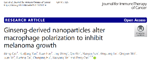 人参(Panax ginseng C. A. Mey)为“百草之王”。味甘微寒,具大补元气,复脉固脱,补脾益肺,生津安神之功效,东西方都应用广泛。2019年11月27日,南京中医药大学曹鹏研究员团队在肿瘤免疫治疗协会(SITC)官方杂志Journal for ImmunoTherapy of Cancer(免疫学1区, IF: 8.676)在线发表论文“Ginseng-derived nanoparticles alter macrophage polarization to inhibit melanoma growth”, 该文首次报道了从新鲜人参中提取的囊泡通过极化巨噬细胞,抑制黑色素肿瘤的生长。本文的通讯作者为曹鹏研究员,第一作者为曹萌副研究员,助理研究员颜怀江和博士研究生韩暄等人参与了研究工作。