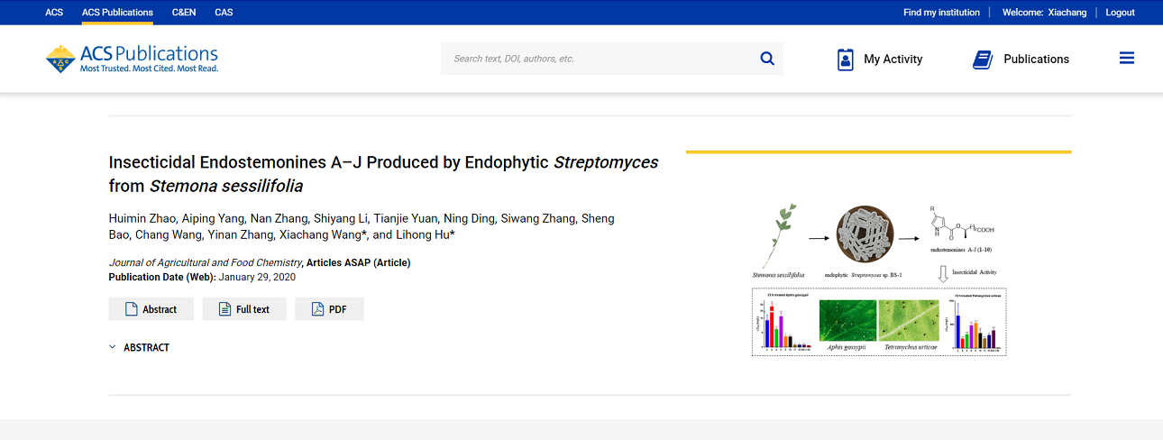 2020年1月29日,公司江苏省中药功效物质重点实验室胡立宏、王吓长教授团队在SCI一区Top期刊Journal of Agricultural and Food Chemistry(简称J. Agric. Food Chem.)上在线发表了论文“Insecticidal Endostemonines A-J Produced by Endophytic Streptomyces from Stemona sessilifolia”。研究生赵慧敏和杨爱萍为共同第一作者。
