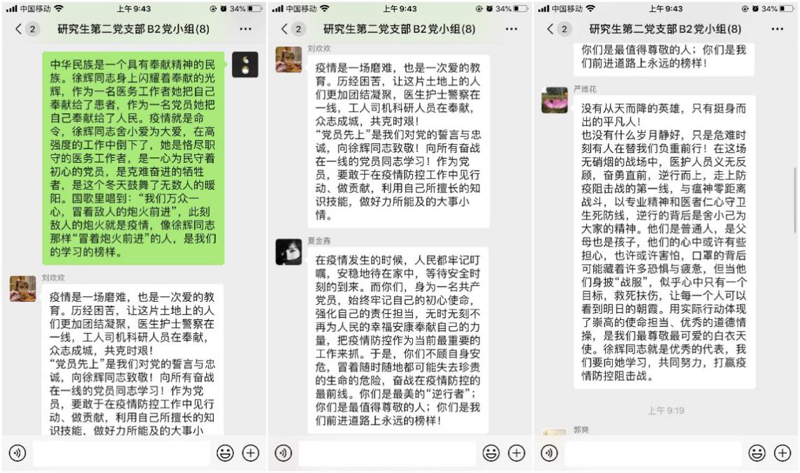 各研究生党支部召开线上学习分享会,交流学习心得,并将徐辉同志思想洗礼转化为投身抗疫志愿服务的实际行动。中药炮制研究生支部薛凡在寒假期间,主动报名参加社区抗疫志愿服务,以点滴行动践行党员初心使命,她说:“我们能在这场没有硝烟的战争中,依然拥有一方净土,就是因为有这么多像徐辉一样,不惧危、不怕险、勇担当的医护人员恪尽职守,奋战在一线。我们虽然没有像一线医务工作者那样悬壶济世,但也应牢记自己的初心与使命,学习他们奉献担当的品格。”