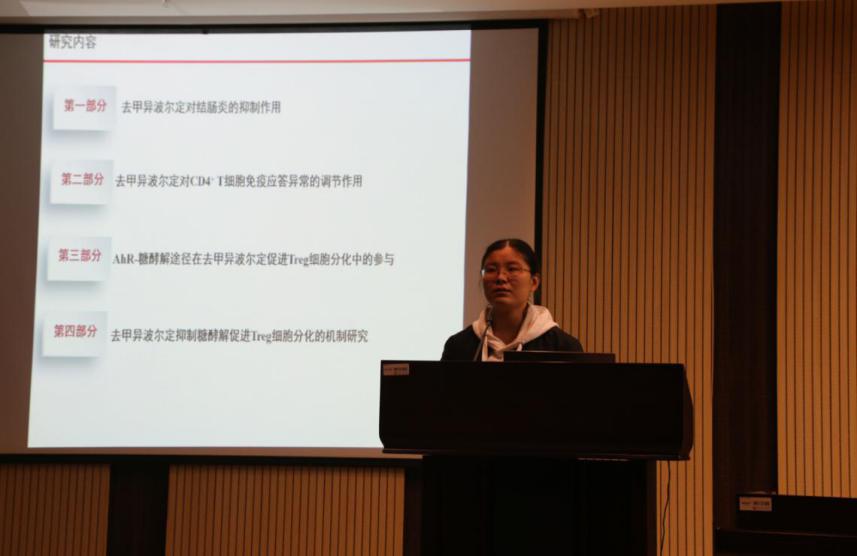 吕祁老师,博士毕业于中国药科大学中药学专业,现任江苏省中药功效物质重点实验室教师。吕老师重点介绍了中药乌药主要活性成分去甲异波尔定(NOR)对小鼠结肠炎的抑制作用和机制研究,系统而全面。其发现NOR可通过调控结肠缺氧微环境中免疫细胞芳烃体,抑制糖酵解,调节H3K9me3等信号通路的综合效应,促进Treg细胞分化,恢复Th17/Treg平衡,发挥抗炎效用。研究成果有助于NOR作为抗结肠炎药物的开发利用。吕老师还对从传统中药中筛选发现抗结肠炎药物的工作设想与思路方法等方面提出了后续研究展望。参会专家也从动物模型构建、中西医对疾病的认识以及成药性研究评价等方面提出了指导和建议。