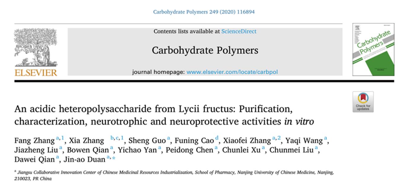 近日,公司江苏省中药资源产业化协同创新中心段金廒教授课题组在多糖领域权威期刊《Carbohydrate Polymers》杂志(IF 7.182,JCR分区:Q1)发表了题为“An acidic heteropolysaccharide from Lycii fructus: purification, characterization, neurotrophic and neuroprotective activities in vitro”的研究论文,详细解析了课题组从宁夏枸杞中提取的一种酸性枸杞多糖的结构特征,并发现该多糖具有明显的体外神经营养和神经修复作用,为进一步了解枸杞及其复杂结构多糖的生物学活性提供了新的研究思路。段金廒教授为本文的通讯作者,张芳副教授为本文的第一作者。