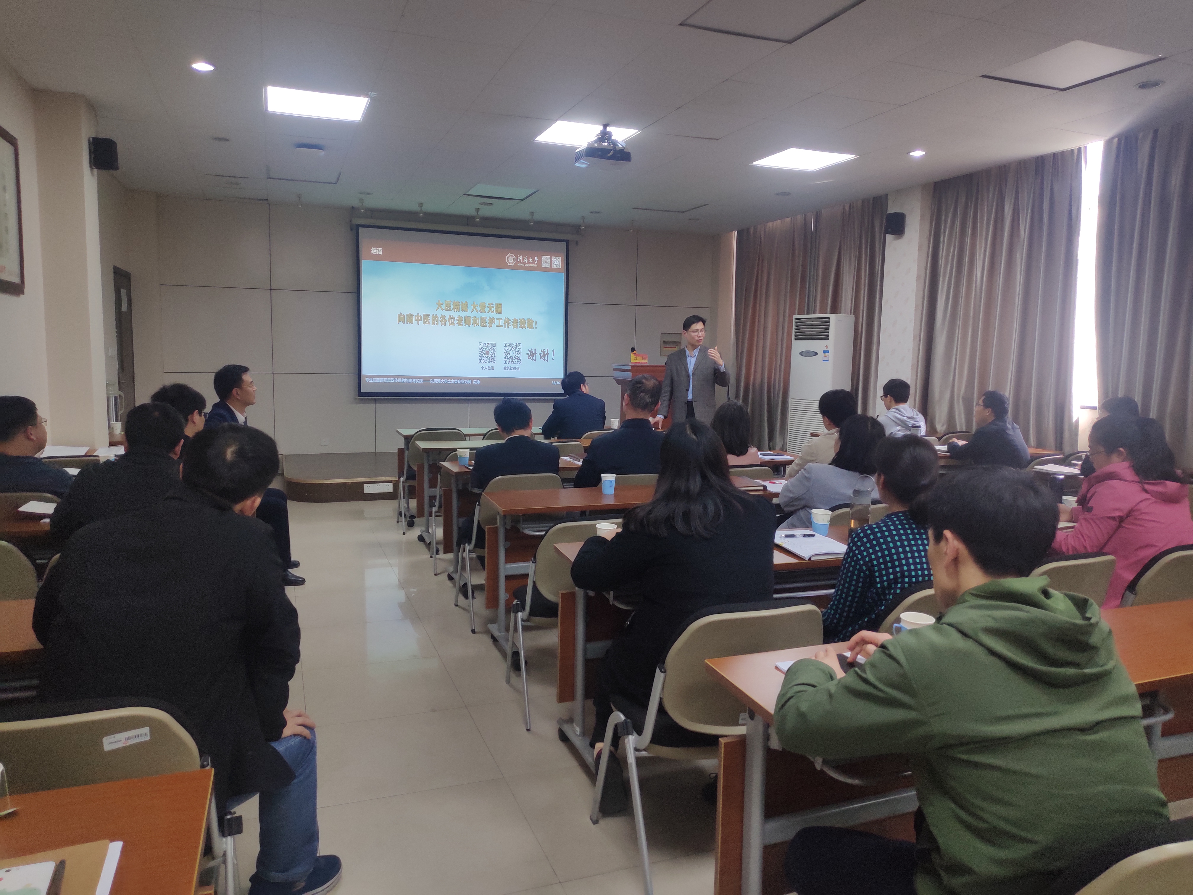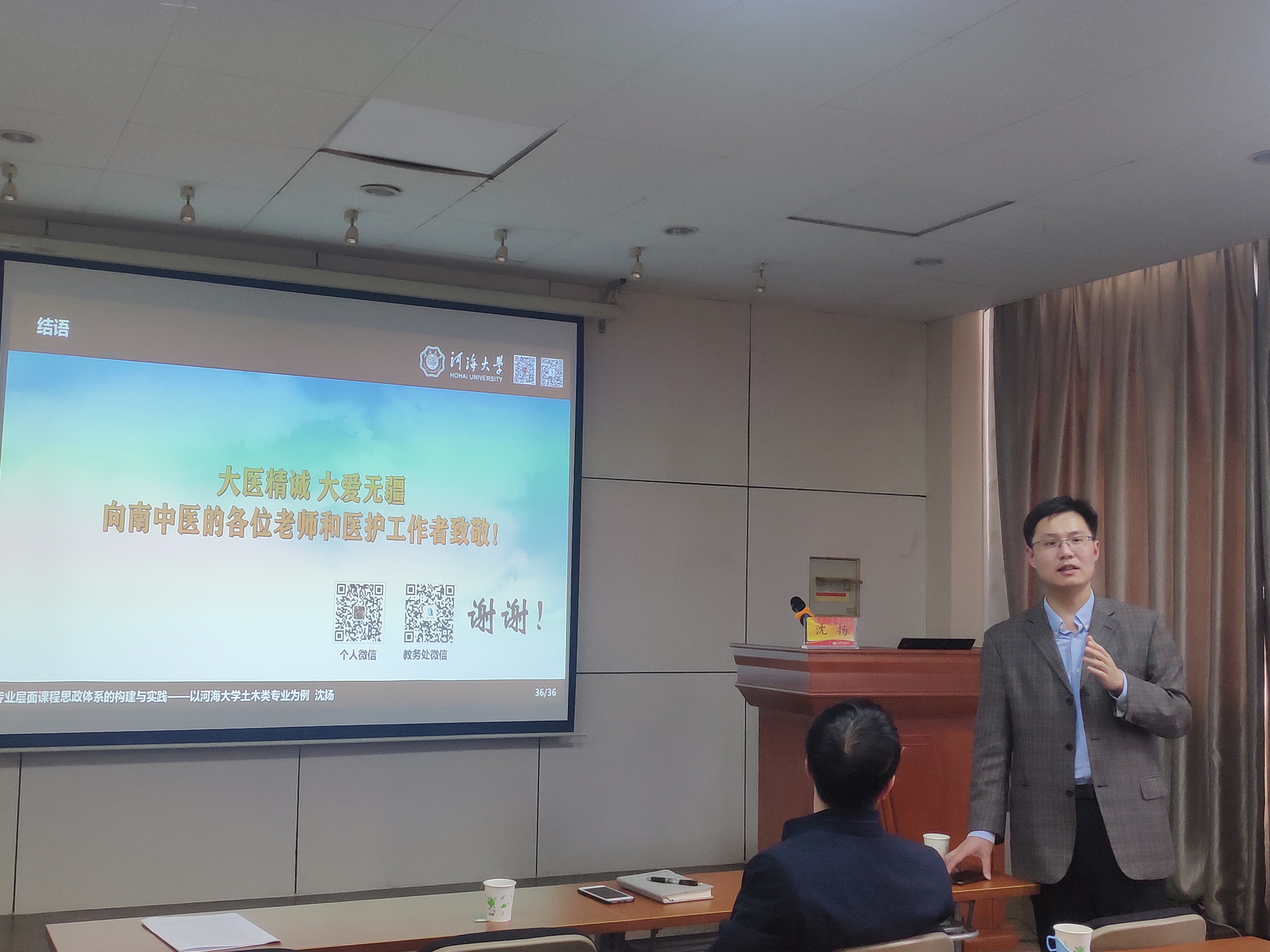 沈教授以河海大学国家一流专业为例,首先,从内生动力指出课程是撑起专业、建设大学的基石,课程的政治性和学理性不(可)能分割,要以员工为中心,转变授课角色定位。其次,从整体之道出发,让课程体系建设回归课堂,将家国情怀、文脉传承融入其中,采用以课程思政全浸润、新工科发展为引领的课程建设方法,破除扁平化,提升课程思政的高阶性。接着,从局部之术,通过举例从职业伦理、唯物史观、工匠精神、人文融通等方面进一步阐释课程思政建设的内容和内涵。最后,从导用并进,提出在员工与老师中间架起沟通的桥梁,让员工学习课程的同时建立起对知识整体一致性的认识。整场讲座旁征博引、生动流畅,诠释通透,引起了老师们的极大关注和兴趣,纷纷表示受益匪浅。