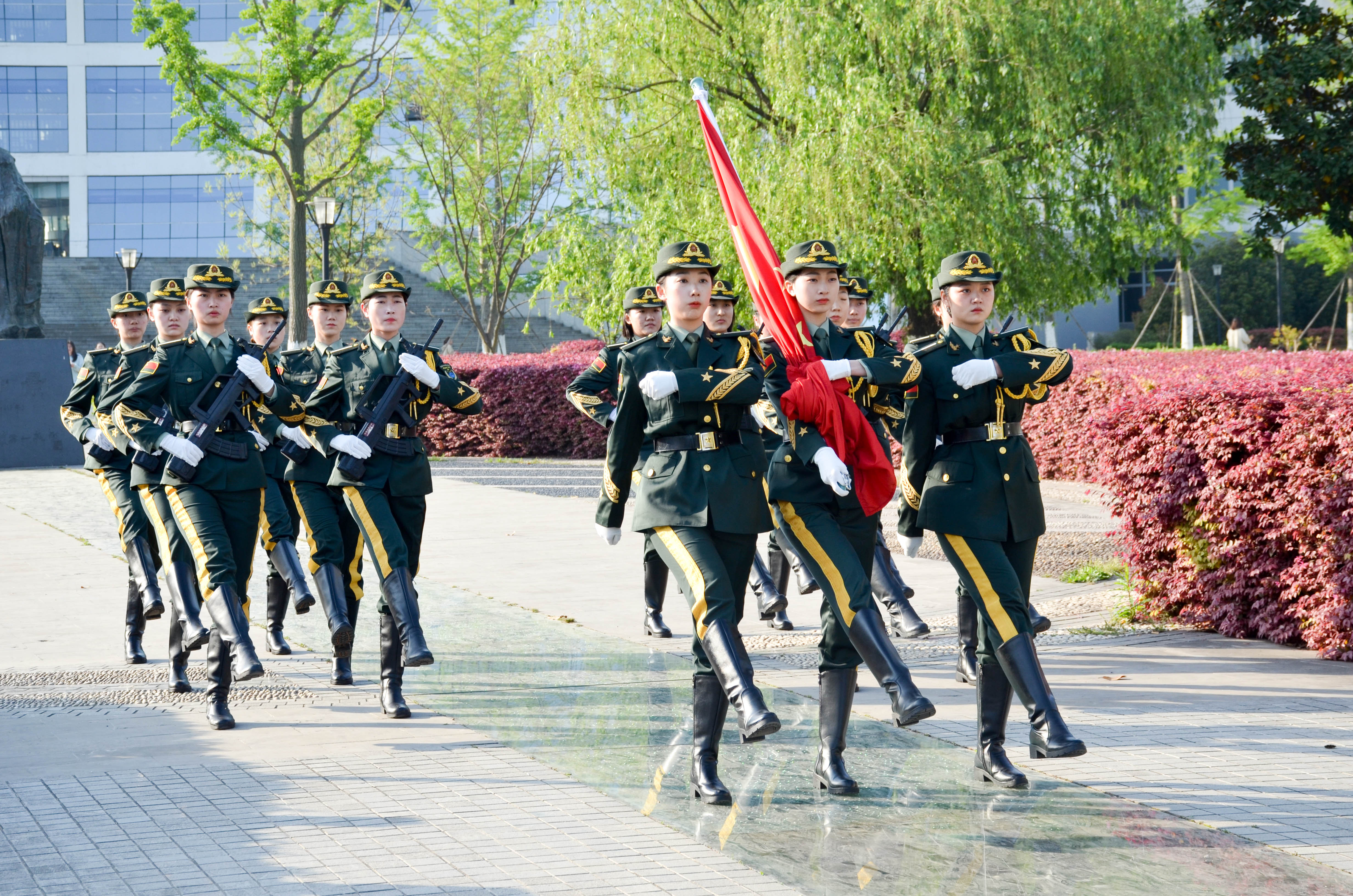 升国旗仪式现场,女子国旗护卫队迈着矫健的步伐,护卫着中华人民共和国五星红旗走向升旗台。全体师生井然有序,巍然肃立。伴随着中华人民共和国国歌响起,全体师生高唱国歌,心中涌起对祖国无限的热爱和崇高的敬意。