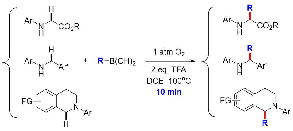 (1)将甘氨酸酯及其类似物与脂肪硼酸的混合物在一大气压的氧气氛围中共热数小时,即可合成一系列非天然氨基酸。该过程无需任何金属催化剂及助剂。