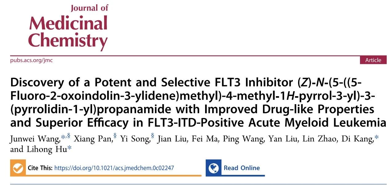 近期,药物化学顶尖期刊Journal of Medicinal Chemistry(影响因子7.446)发表了胡立宏教授团队开发的一种对FLT3-ITD突变型急性髓性白血病具有显著疗效的新型FLT3抑制剂,青年教师王均伟和博士生潘祥、宋祎为文章的共同第一作者,胡立宏教授和青年教师康迪为共同通讯作者。