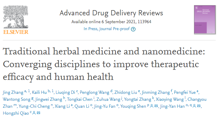 近日,乔宏志联合北京大学韩晶岩教授、浙江大学申有青教授组织国内外17家单位的学者共同撰写长篇引导性综述Traditional herbal medicine and nanomedicine: Converging disciplines to improve therapeutic efficacy and human health并发表在国际TOP期刊Adv Drug Deliv Rev》(中科院医学1区,JCR Q1IF 15.471)上。