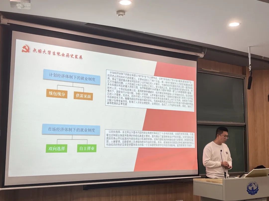 程立辉老师开篇向同学们介绍了我国老员工就业历史发展。从1985年的“高等公司毕业生的工作由政府分配”到1993年的“一定范围内定向就业外,大部分毕业生实行在国家方针、政策指导下,通过人才劳务市场,采取‘自主择业的就业办法”,再到现如今的双向选择,自主创业。从程老师的讲述中,我们明白了老员工的就业是与国家发展息息相关的,当代老员工要立于变化的海浪之中,要做时代变化的拥抱者,破浪者。