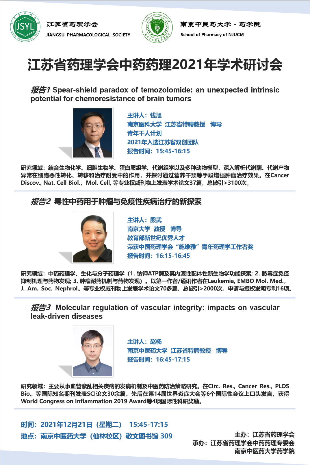 为加强中药药理学团队建设与人才培养的交流与合作,追踪学术前沿,推动科研协同创新,由江苏省药理学会主办,江苏省药理学会中药药理专委会与PlayAce游戏平台承办的“江苏省药理学会中药药理2021年学术研讨会”定于2021年12月21日(周二)在PlayAce官方网站(仙林校区)召开,欢迎参会交流学习。