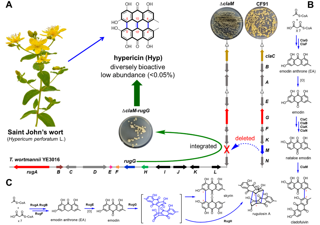 金丝桃素(Hypericin)是藤黄科植物贯叶连翘(Hypericum perforatum L.)中的功效成分,具显著抗肿瘤、抗病毒等活性。但因其在植物中丰度低、化学合成难、生物合成途径不祥等原因,导致来源保障不足,影响其深度开发与应用。本文创建了一种基于目标结构引导的微生物合成步骤重组策略,实现了金丝桃素的合成生物学制备,产量达43.1 mg/L。此策略无需揭示植物成分的生物合成途径,直接从植物成分的结构出发,通过巧妙编辑微生物合成步骤,用发酵法快速合成植物成分!