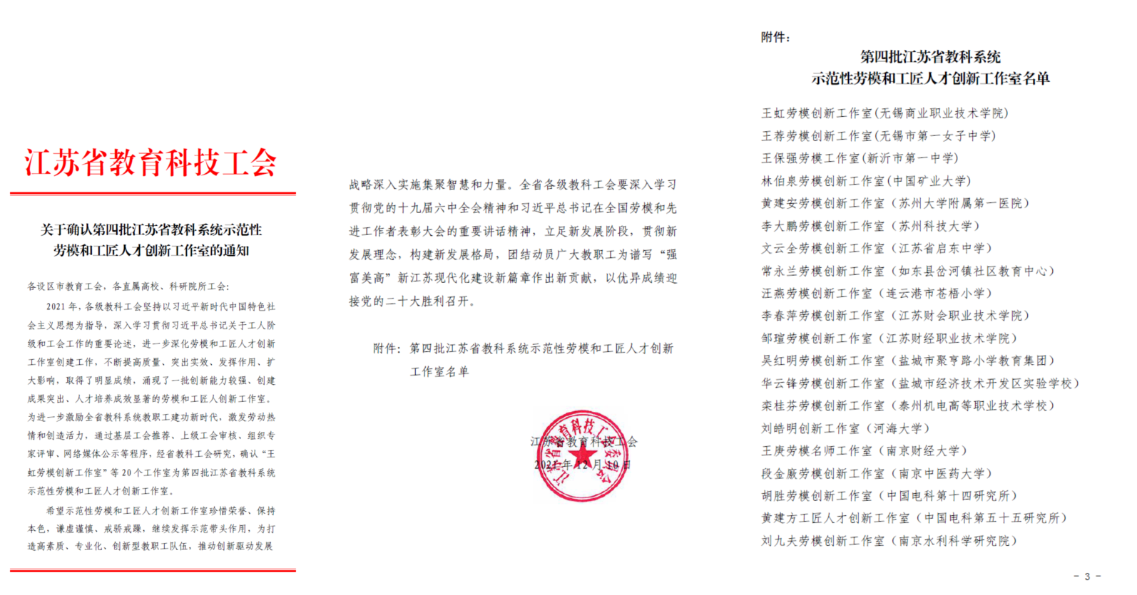 为进一步激励全省教科系统教职工建功新时代,激发劳动热情和创造活力,通过基层工会推荐、上级工会审核、组织专家评审、网络媒体公示等程序,经省教科工会研究,确认 20 个工作室为第四批江苏省教科系统示范性劳模和工匠人才创新工作室。公司段金廒教授牵头申报的“段金廒劳模创新工作室”获批入选。