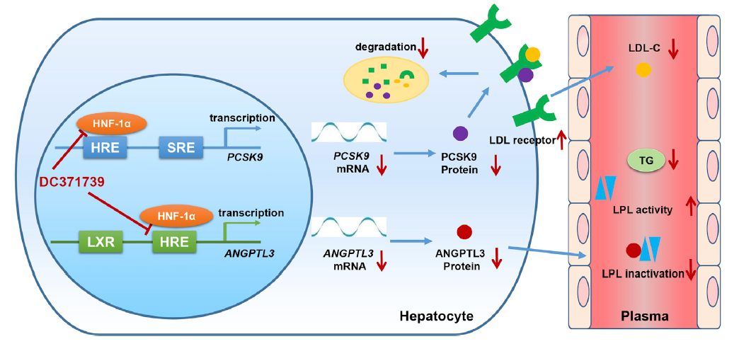 该研究还指出,DC371739 的作用机制不同于已知的小分子降血脂药物,DC371739 通过直接与转录因子 HNF-1α 结合,从而阻碍 PCSK9 和 ANGPTL3 这两个关键基因的转录。因此,DC371739 能够同时抑制 PCSK9 和 ANGPTL3 的转录,是一种很有前途的降血脂候选药物。