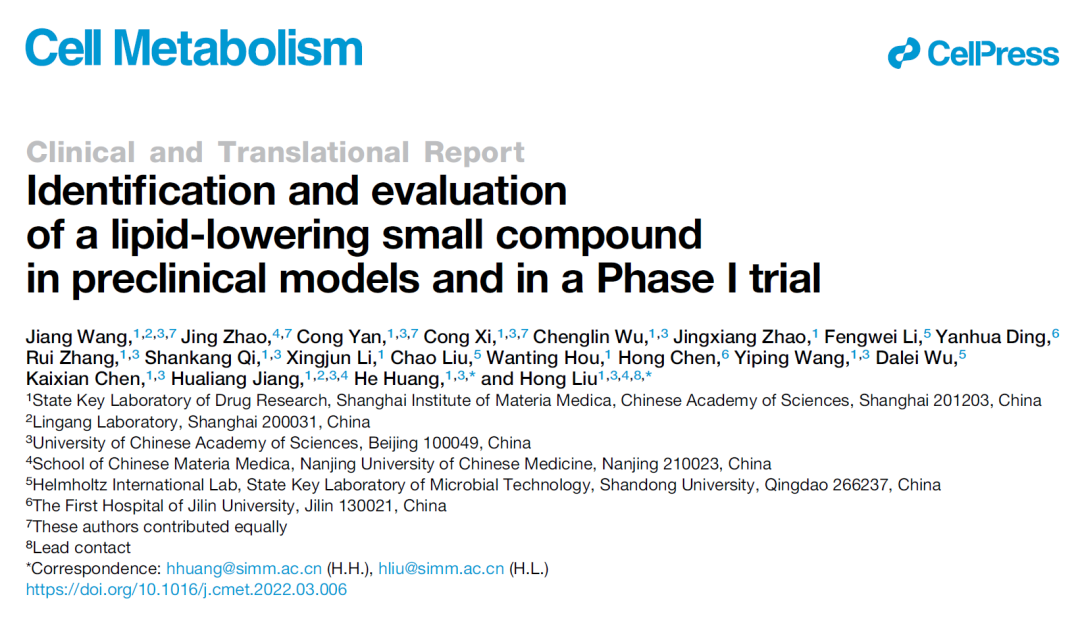 近日,新中药学经理柳红教授团队和黄河教授团队合作,在 Cell Metabolism 期刊发表了题为:Identification and evaluation of a lipid-lowering small compound in preclinical models and in a Phase I trial 的研究论文。新中PlayAce游戏平台在读博士研究生赵晶是共同作者之一。