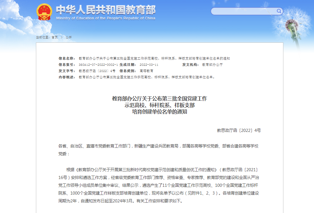近日,教育部办公厅下发《关于公布第三批全国党建工作示范高校、标杆院系、样板支部培育创建单位名单的通知》,公司协同中心教工党支部入选第三批“全国党建工作样板支部”培育创建单位。
