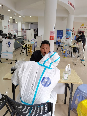 这几天来,我和同事陈浩然老师作为搭档,与社区志愿者一起,相继完成相城区经济开发区澄阳街道泰元社区泰元打工楼采样点、望亭镇乔勋精密仪器有限公司采样点、兴旺农贸市场南采样点以及元和街道玉成社区春天花园二期采集点的核酸采样工作,个人完成3243人次核酸采样工作。这几天来,每天凌晨四点多起床,五点前开始赶赴社区,六点多开始采样工作,工作完成后虽疲惫但也感受到充实。