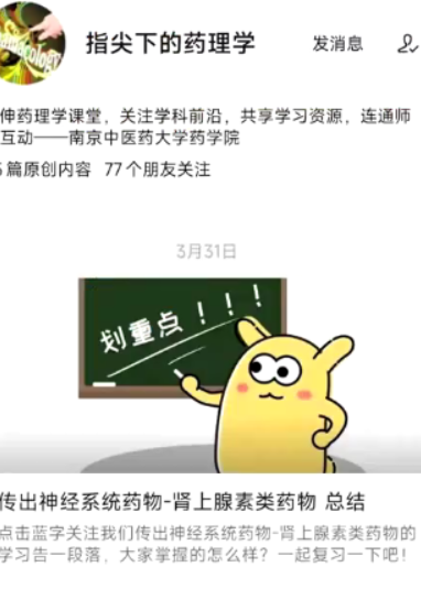 在此介绍一下两位学姐都推荐过的药理教研室主办的公众号——指尖上的药理学和英语文献悦读。其中包含药理学的教学要求以及复习提纲,帮助大家归纳整理知识点,延伸药理学课堂,共享学习资源。