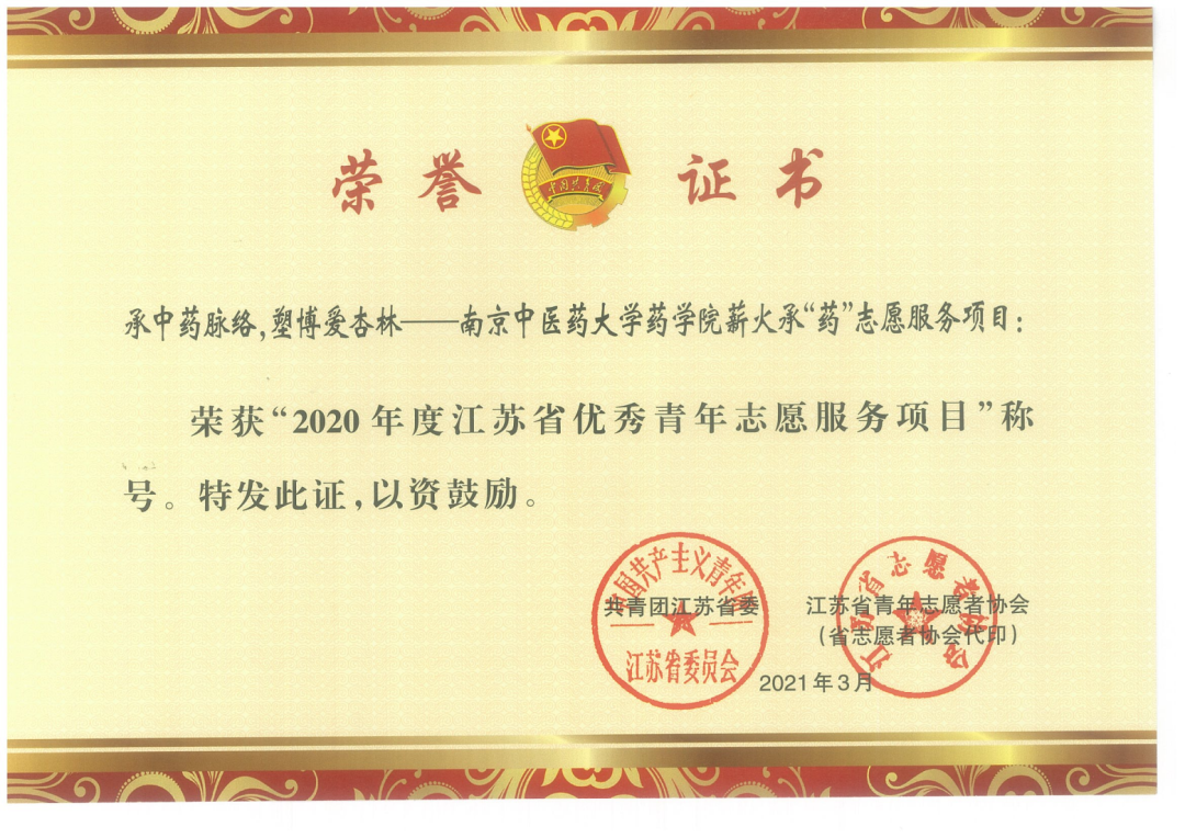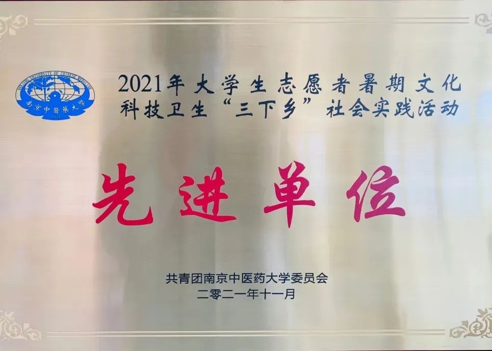 “承中药脉络,塑博爱杏林”志愿服务项目持续开展近十年,获江苏省优秀青年志愿服务项目;感恩励志社获江苏省青年志愿服务行动组织奖、南京市优秀志愿社团、仙林地区高校十大公益组织等荣誉。以公司西部计划优秀志愿者陈晓明为原型的电视剧《月亮之恋》在央视播出;“全国优秀共青团员”姚泽洲放弃保送交大的机会,前往国家级贫困县湖南安化县开展扶贫工作。