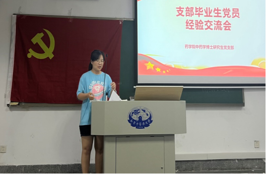 作为中药药理方向的毕业生党员代表王飞虾同志首先发言。她结合其研究方向和大家一起探讨了如何从临床实践中发掘疗效确切的中药复方,形成“物质-药代-功效”研究模式,启发大家怎样从临床中发现问题,找寻疾病新靶标,并从中药复方相关单体成分进行靶点确证,明确单体成分与靶点具体作用模式,从而将其开发为抗某疾病的潜在药物,并能为传统复方临床应用赋予科学内涵。