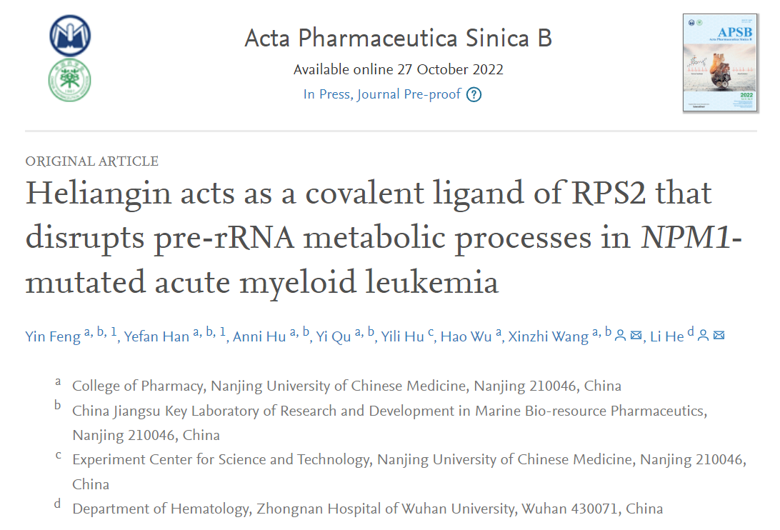 2022年10月27日,《药学学报》英文刊(Acta Pharmaceutica Sinica B, IF=14.903)在线发表公司江苏省海洋药用生物资源研究与开发重点实验室王欣之副教授、吴皓教授等联合武汉大学中南医院血液内科何莉副主任医师课题组论文:Heliangin acts as a covalent ligand of RPS2 that disrupts pre-rRNA metabolic processes in NPM1-mutated acute myeloid leukemia。本研究是从海洋滩涂植物菊芋(Helianthus tuberosus L.)茎叶提取物中分离得到的倍半萜内酯类成分-Heliangin(HEL)具有抗NPM1基因突变型急性髓系白血病(AML)作用,不仅为NPM1基因突变型AML的治疗提供新的靶向药物分子模板,还为核糖体合成通路抑制剂的研发提供了新的思路。