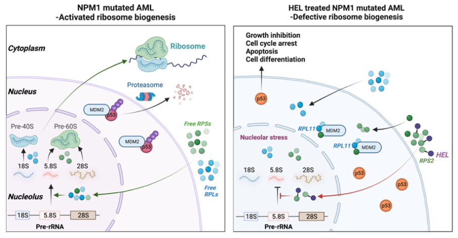 通过与小分子核糖体蛋白RPS2共价结合, HEL扰乱了NPM1基因突变型AML的核糖体生物合成通路,调控下游RPs-MDM2-p53通路,导致相应的效应。