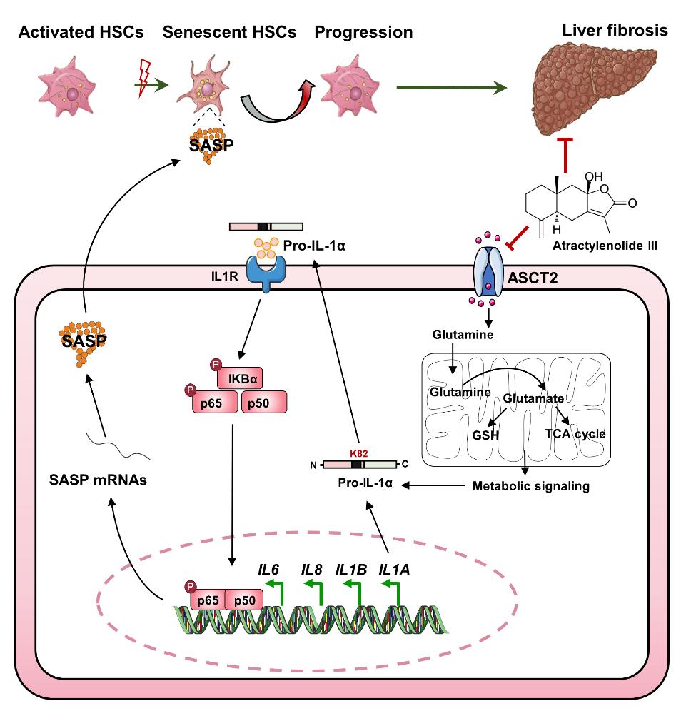 该研究首次发现谷氨酰胺转运蛋白ASCT2在肝纤维化患者及小鼠的肝星状细胞(HSC)中异常高表达,且ASCT2的抑制表现出抗肝纤维化效应。进一步机制研究揭示,抑制ASCT2可以诱导活化型HSC衰老并通过IL-1α/NF-κB反馈回路减少衰老HSC促炎SASP表达。此外,利用分子模拟、细胞热转移分析技术、微量热泳动技术及定点突变等技术手段,发现中药活性成分白术内酯III的-OH基团与ASCT2的Asn230残基直接结合并抑制其功能,从而鉴定出白术内酯III是ASCT2的天然抑制剂,并通过诱导活化型HSC衰老实现对肝纤维化的治疗作用。该研究为将白术内酯III开发为有潜力的抗肝纤维化药物提供了理论依据。