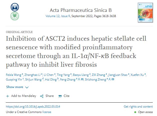 2022年9月,公司郑仕中、张峰教授团队在国际知名学术期刊Acta Pharmaceutica Sinica B(中国科技期刊卓越行动计划重点期刊,中科院医学一区,IF: 14.903)上发表抗肝纤维化药物靶标方面的最新研究成果:“Inhibition of ASCT2 induces hepatic stellate cell senescence with modified proinflammatory secretome through an IL-1α/NF-κB feedback pathway to inhibit liver fibrosis”。青年教师王飞虾为该论文的第一作者,郑仕中教授、张峰教授为该论文的共同通讯作者。