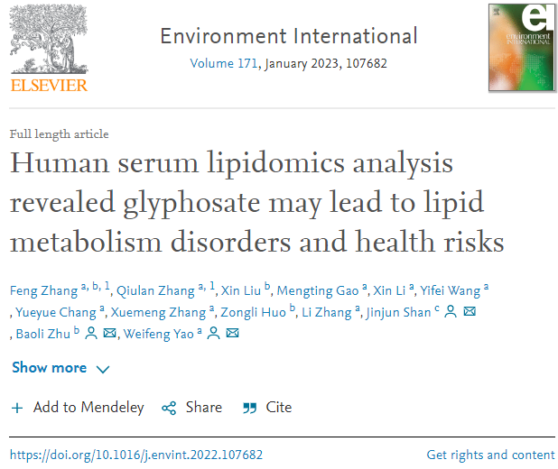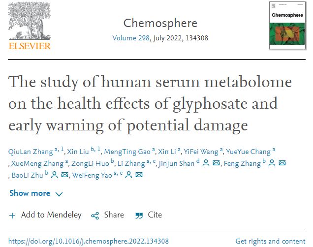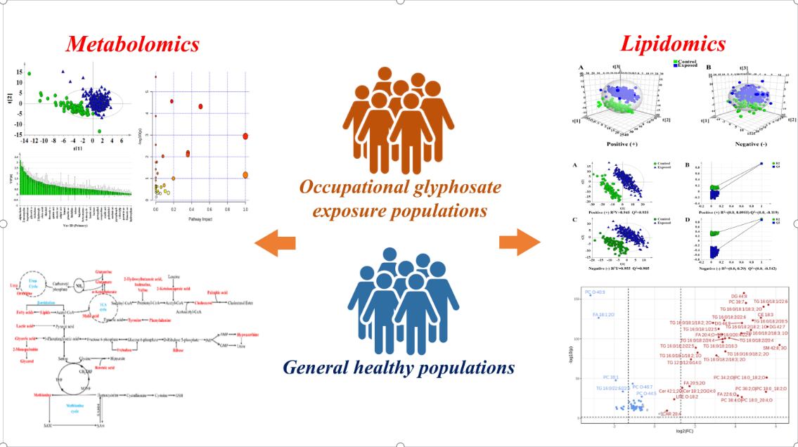 草甘膦类除草剂(GBH)是世界上使用最广泛的农药之一,然而目前关于人类长期接触草甘膦的潜在风险研究甚少。该团队对来自普通人群和化工厂工人约400份血清样本进行了代谢组学研究,显示草甘膦接触可显著扰动人血清代谢物及相关代谢通路,表明长期接触草甘膦后人体健康状况发生了变化,并且可能会进一步演变成多种疾病;筛选出苯甲酸、2-酮异己酸、α-酮戊二酸和油酸甘油酯等与草甘膦密切相关的潜在生物标志物。该研究为由草甘膦引起的健康影响机制提供了新的见解,提供了反映人身体健康状态的信息,并有助于改善风险评估的卫生政策。研究成果以“The study of human serum metabolome on the health effects of glyphosate and early warning of potential damage”为题在线发表于Chemosphere上。PlayAce官方网站硕士研究生张秋兰和江苏省疾病预防控制中心刘昕博士为本文共同第一作者,PlayAce官方网站姚卫峰教授、单进军教授和江苏省疾病预防控制中心张锋博士、朱宝立教授为本文共同通讯作者,PlayAce官方网站为第一通讯单位。