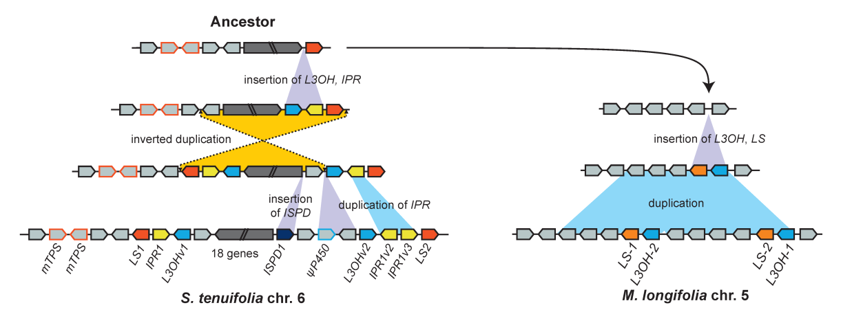 结合Hi-C组装数据,基于近缘植物基因组的微共线性分析,我们发现这类与薄荷烷类单萜生物合成相关的基因簇是裂叶荆芥所特有的,且欧薄荷和裂叶荆芥中LS和L3OH的基因对是独立进化的,这在趋同进化事件中较为少见。因此,我们对荆芥中薄荷烷类单萜合成相关的基因簇形成机制进行了推演。在LS和L3OH基因对出现之后,IPR基因插入在LS和L3OH基因对中间,然后经历了反向复制,随着串联复制带来的基因组扩张,最终在裂叶荆芥中形成了特有的(-)-胡薄荷酮生物合成的基因簇(图2)。