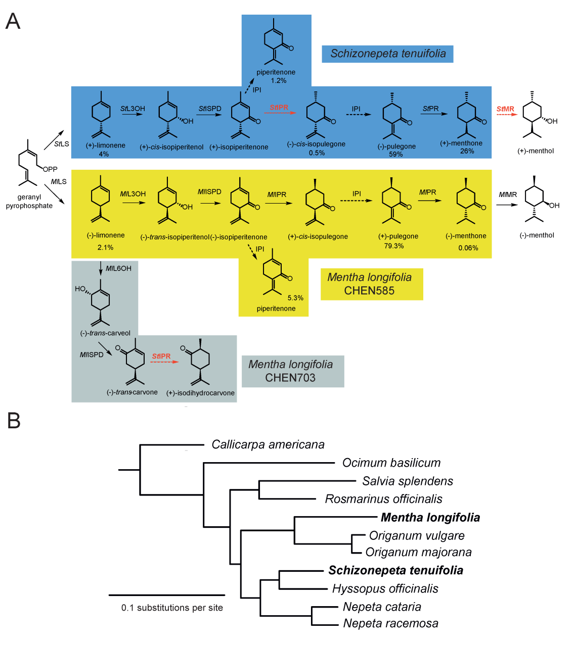 荆芥为唇形科裂叶荆芥属裂叶荆芥Schizonepeta tenuifolia (Benth.) Briq.的地上部分。具有解表散风,透疹,消疮等功效,为临床常用中药。新型冠状病毒(COVID-19)感染者居家中医药干预指引中,治疗推荐的银翘散、荆防颗粒等均使用了荆芥。荆芥的主要药效物质为挥发油,具有较强的抗炎、抗病毒和抗氧化作用。经课题组前期研究发现荆芥挥发油主要以(-)-胡薄荷酮型的薄荷烷类单萜为主。1990年代,美国科公司院士Rodney Croteau首次破解了欧薄荷中(+)-胡薄荷酮生物合成路径,但数十年以来,我们对于(-)-胡薄荷酮生物合成的机制尚且未知。本研究首次组装了裂叶荆芥染色体级别的参考基因组。其中在裂叶荆芥中发现的属于Old Yellow Enzyme家族的StIPR和在薄荷中属于Short Double Reductase家族的MlIPR具有相同的催化功能。同时我们发现StIPR可以催化香芹酮生成二氢香芹酮,也完善了欧薄荷中香芹酮的下游合成路径。但两者却分属于不同的蛋白家族,说明两个物种中的这一步合成路径呈现趋同进化。