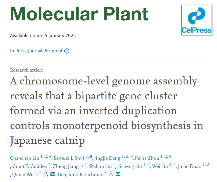 2023年1月6日,公司吴啟南教授团队和英国约克大学Benjamin R Lichman教授团队在Molecular Plant(中科院1区, IF:21.9)杂志合作在线发表了题为"A chromosome-level genome assembly reveals that a bipartite gene cluster formed via an inverted duplication controls monoterpenoid biosynthesis in Japanese catnip"的研究论文。公司吴啟南教授和英国约克大学Benjamin R Lichman教授为该论文的通讯作者,公司刘潺潺讲师、英国约克大学Samuel Smit、公司博士研究生党静洁和周佩娜为论文的共同第一作者。本研究首次报道了唇形科植物裂叶荆芥(药材名:荆芥;别名:日本猫薄荷)的高质量基因组,破解了(-)-胡薄荷酮生物合成路径中的关键酶基因,并发现了一个包含四步胡薄荷酮生物合成路径的基因簇。