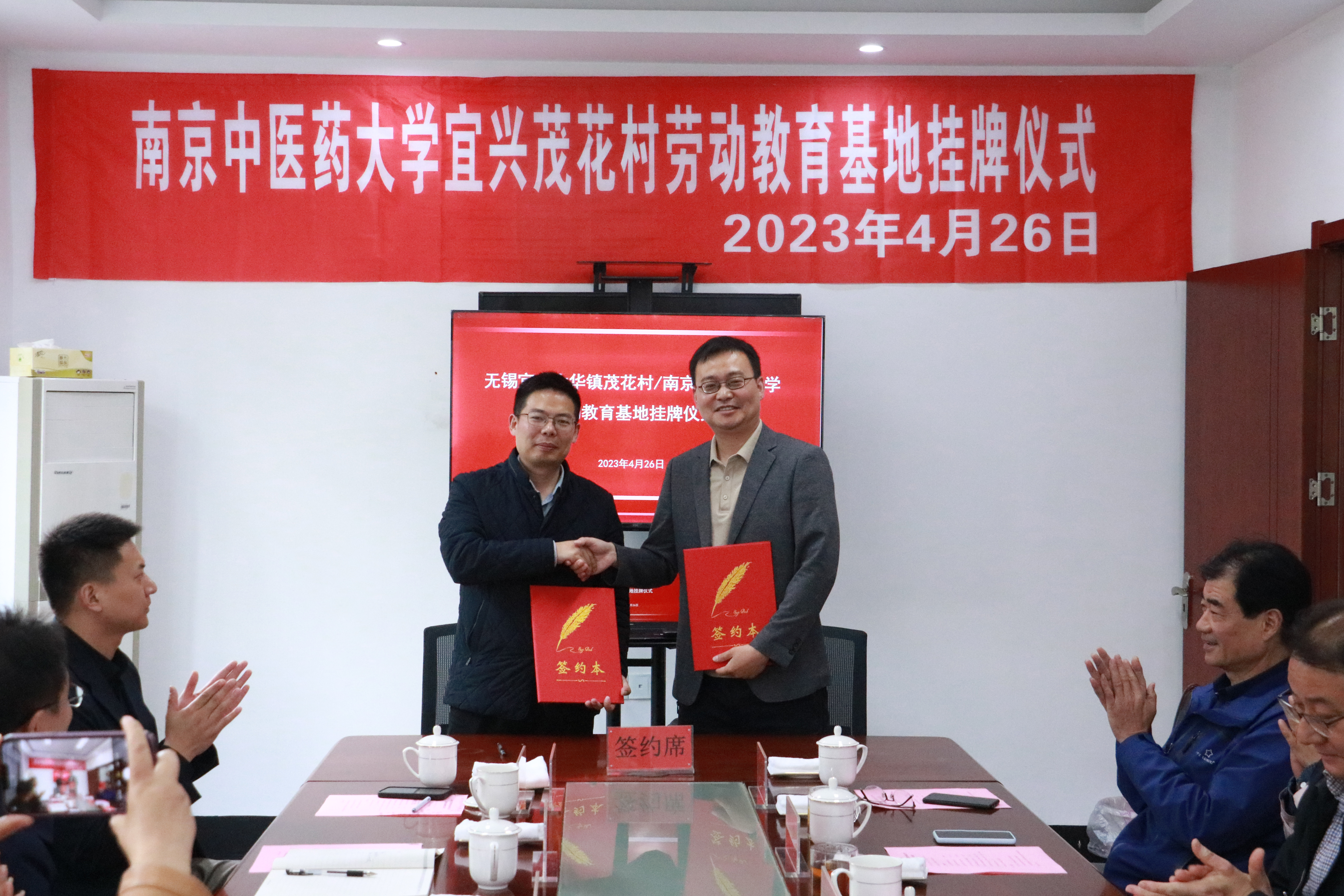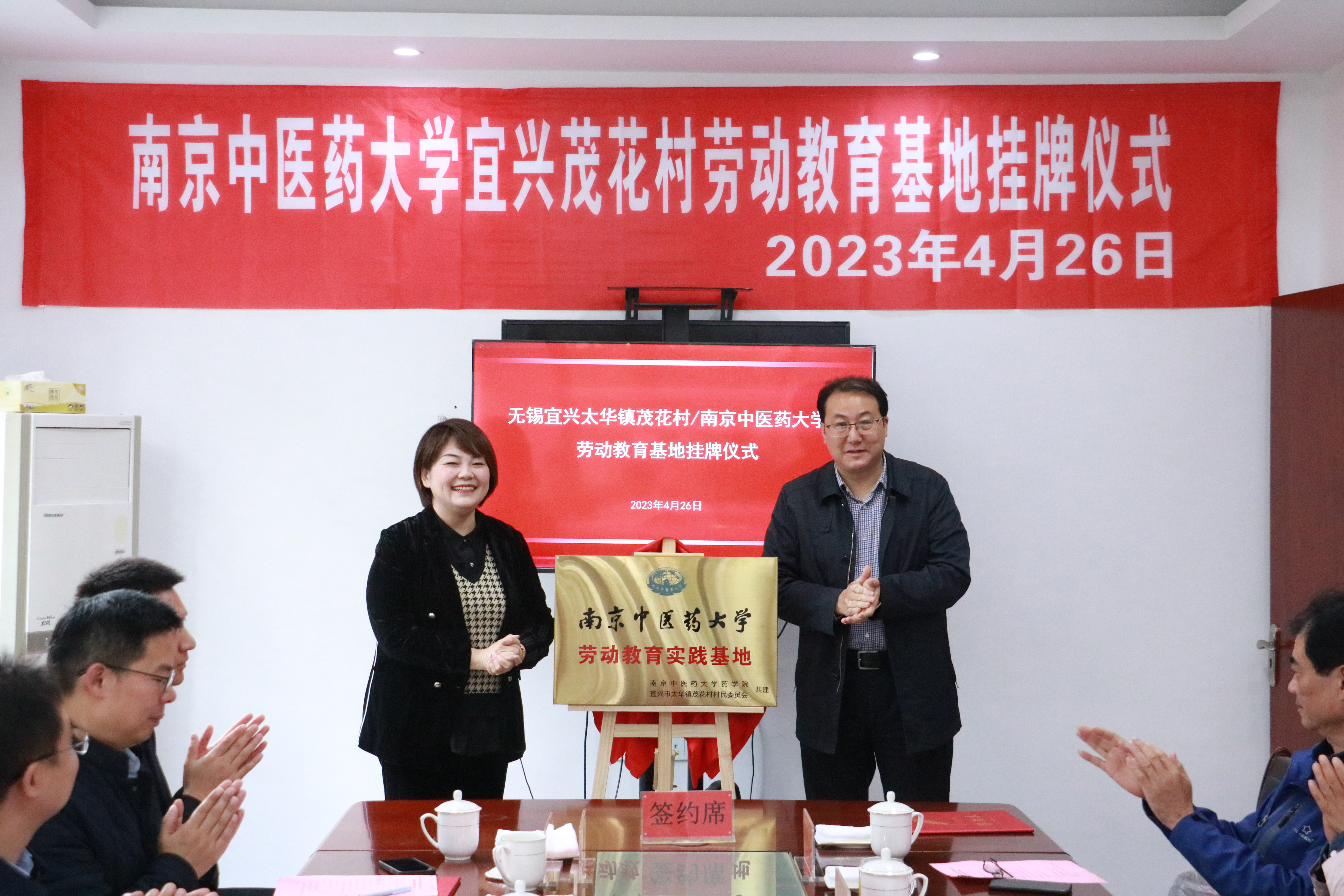 2023日4月26日,PlayAce游戏平台与宜兴茂花村共建“劳动教育实践基地”正式签约揭牌,PlayAce官方网站团委书记陈小进、PlayAce官方网站教务处副处长陈丹丹、公司党委副书记副经理谢波、PlayAce游戏平台中药资源教研室主任谷巍、宜兴市太华镇党委副书记刘俊尧、太华镇政法委员兼茂花村党支部书记曹凯、宜兴太华镇水利站站长周维,以及师生代表参与签约揭牌仪式。