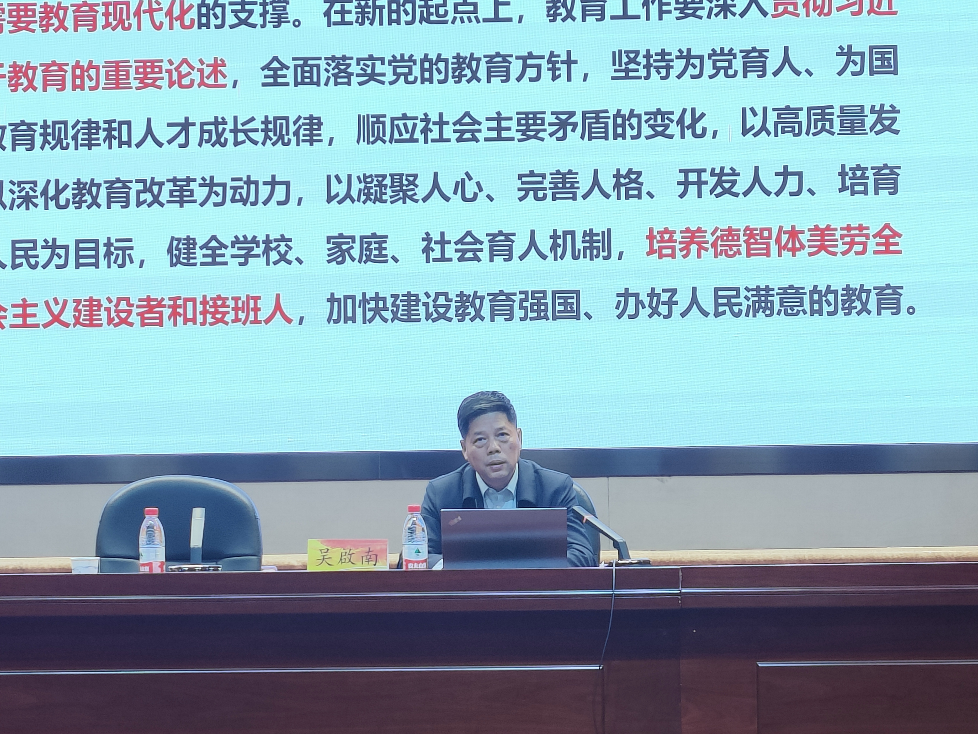 吴啟南指出,强国必先强教,中国式现代化需要教育现代化的支撑。党的十八大以来,我国教育面貌发生格局性变化。在新的起点上,教育工作要深入贯彻落实习近平总书记关于教育的重要论述,牢牢把握教育改革发展的“九个坚持”,围绕面向教育现代化的十大战略任务,培养德智体美劳全面发展的社会主义建设者和接班人加快建设教育强国、办好人民满意的教育。