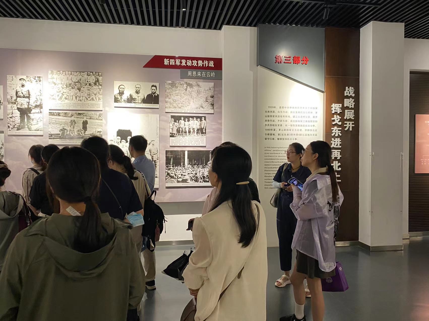 茅山新四军纪念馆是展示以茅山为中心的苏南抗日根据地历史的专题性纪念馆。全体党员走进茅山新四军纪念馆,迎面是以茅山为背景的新四军战斗群雕。馆内,基本陈列分为“苏南人民奋起抗击日本侵略军”、“茅山抗日根据地的开辟”、“茅山新四军东进北上”、“苏南抗日根据地的艰苦坚持”、“苏南人民夺取抗日斗争的胜利”等五个部分。各种珍贵文物和历史资料真实、形象、生动地再现了陈毅、粟裕、谭震林等老一辈无产阶级革命家的光辉业绩和当年抗日军民浴血奋战的悲壮场面。