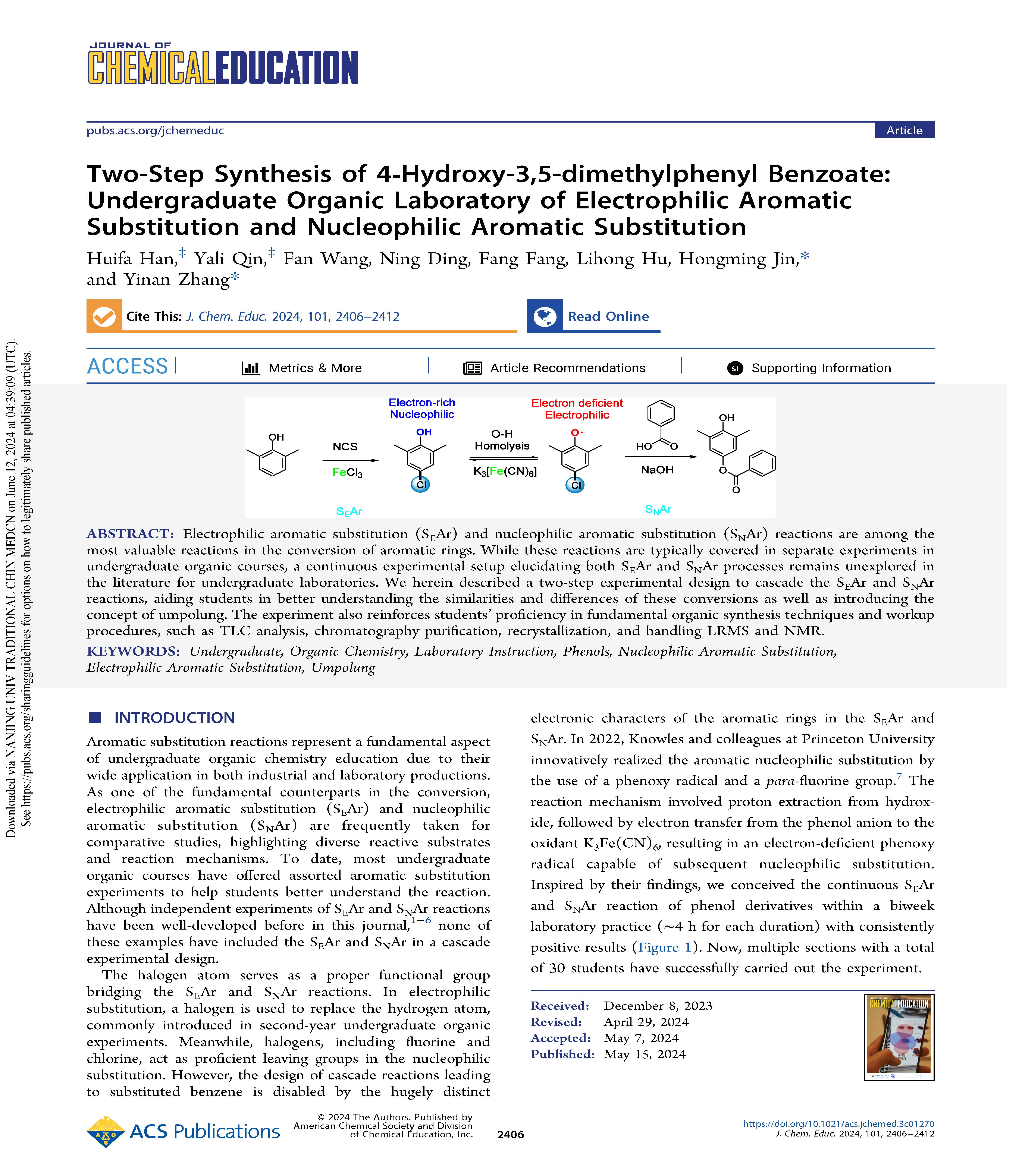 近期,PlayAce游戏平台张毅楠教授与金弘明教授在美国化学会的化学教育期刊《Journal of Chemical Education》上发表了题为“Two-step synthesis of 4-hydroxy-3,5-dimethylphenyl benzoate: undergraduate organic laboratory of electrophilic aromatic substitution and nucleophilic aromatic substitution”的文章(DOI:https://pubs.acs.org/doi/10.1021/acs.jchemed.3c01270),本工作描述了一个全新的SEAr 和 SNAr串联步骤本科实验设计及在中药学长学制有机化学实验教学中的运用。