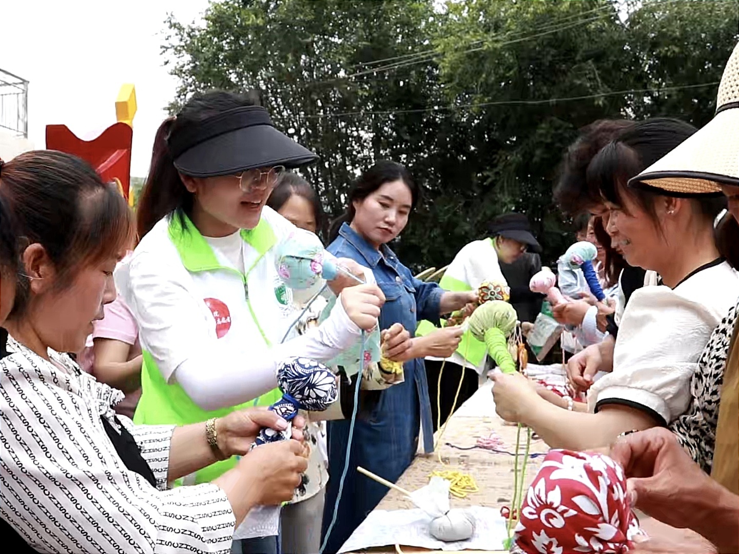 在义诊活动开展的同时,中医药文化宣传活动也在村委会的小院子里如火如荼地举行。实践团成员以当地道地药材当归、黄芪为切入点,为村民们带来了中医药文化特色讲座,制作DIY中药防疫香囊、艾草锤,品尝药食同源食品,学习中医传统养生操等活动。