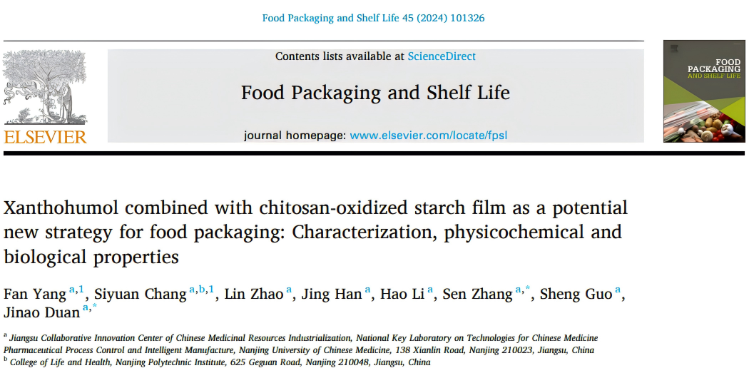 2024年7月,Food Packaging and Shelf Life(IF 8.5,中科院1区,TOP)在线发表了“Xanthohumol combined with chitosan-oxidized starch film as a potential new strategy for food packaging: Characterization, physicochemical and biological properties”一文,从中药废弃物中获得黄腐酚等异戊烯黄酮,并首次探索了异戊烯黄酮在中药复合膜中的应用。杨帆为论文第一作者,段金廒、张森为通讯作者。