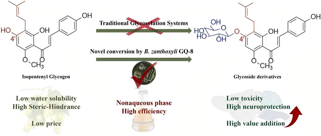 团队进一步采用生物转化技术实现异戊烯黄酮的糖苷化转化,提高生物活性和经济价值,论文“Efficient glycosylation and in vitro neuroprotective evaluation of abundant prenylflavonoid in hops”发表在Process Biochemistry(IF 3.7)上,纪雯昕为第一作者;此外,杨秉乾以第一作者在中国中药杂志(中文卓越期刊)上发表科研论文。令人惊喜的是,纪雯昕和杨秉乾均是23级硕士(本科分别为公司19食品和19中药),两人能在研一阶段以第一作者发表论文,得益于其在本科阶段便得到了公司和协同中心的大力培养。