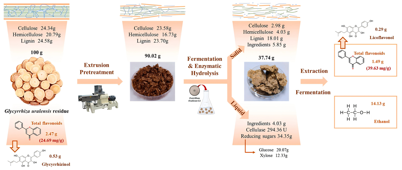 中药资源循环经济是段金廒教授率先提出的创新理念,也是解决中药资源循环利用卡脖子问题的关键所在。恽辰珂同学从本科开始接受段老师的指引和熏陶,立志以生物转化技术推动甘草药渣、丹参药渣等中药废弃物高值化利用。2024年6月,Bioresource Technology(IF 9.7,中科院1区,TOP)在线发表了“Comprehensive reutilization of Glycyrrhiza uralensis residue by extrusion-biological pretreatment for coproduction of flavonoids, cellulase, and ethanol”一文,以甘草药渣为研究对象,采用物理-生物耦合的连续式绿色处置技术实现纤维素酶、乙醇、异戊烯黄酮等产品的高效联产,恽辰珂、常思源为第一作者,段金廒、张森、李冰峰、郭盛等为论文主要贡献者。